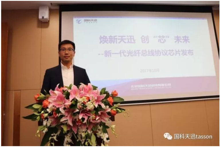 国科天迅市场部经理徐俊亭为大家讲解并发布国内高可靠光纤通信领域的首款总线协议芯片产品。